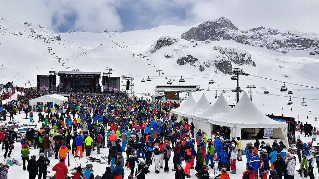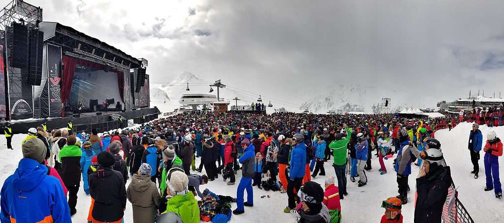 The Top of the Mountain stage brings top stars from around the world in to Ischgl to perform on a stage set aright t the top of the Silvretta ski area. The stage is lifted up by helicopter or cable car piece by piece to be built there, and get the stage ready for action.