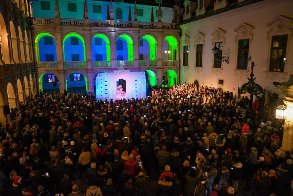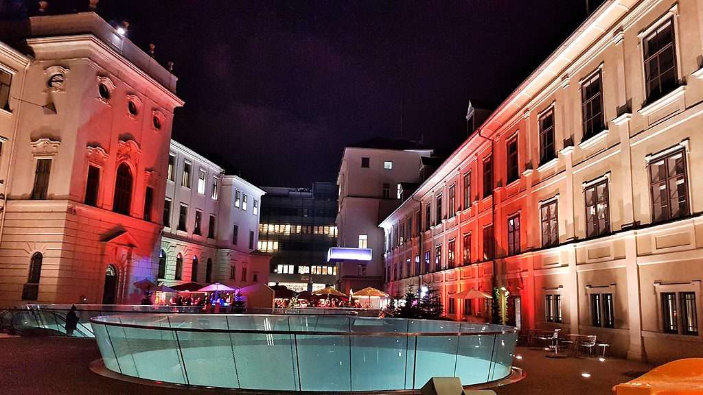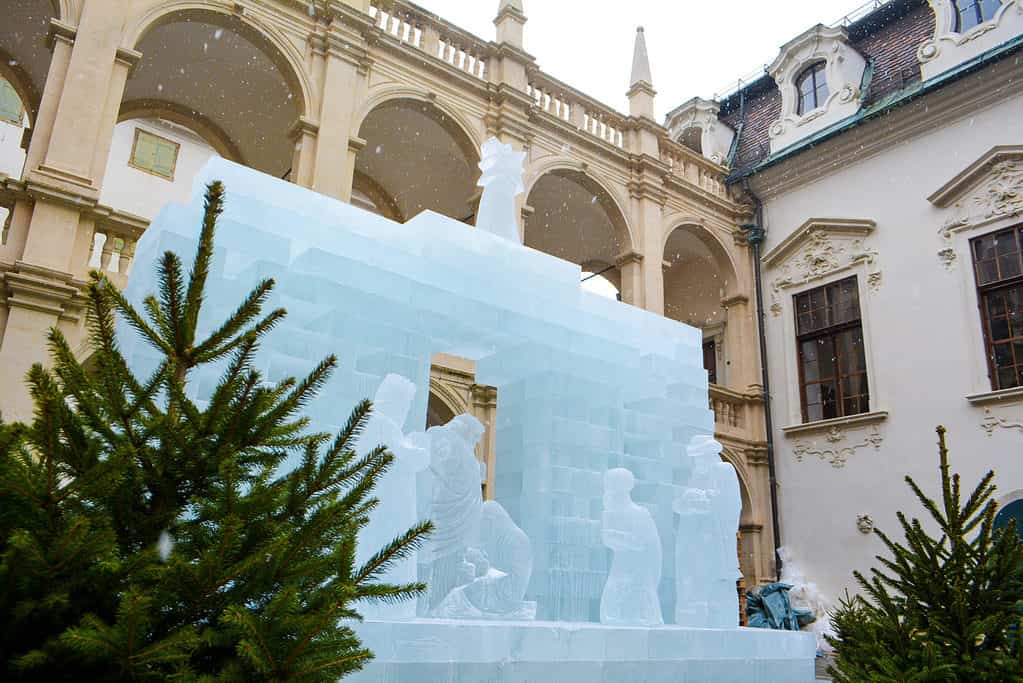Start the morning off by wandering through the beautiful Renaissance courtyard in the city center behind the city hall. If you’re lucky, you might even catch a glimpse of the life-sized ice crib in the Landhaushof, the crib this year was carved by a Finnish ice artist, Kimmo Frosti.