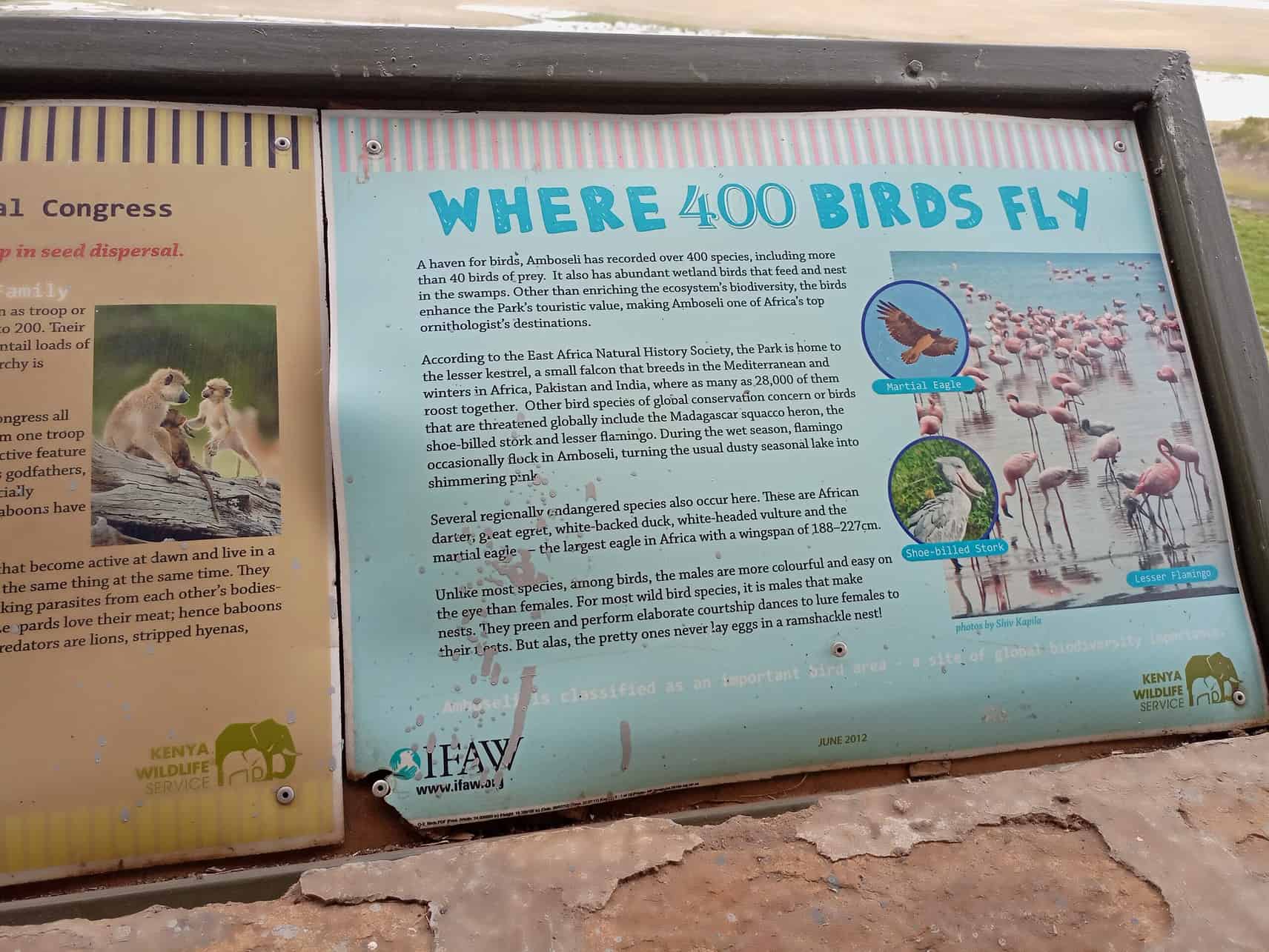 Atop the hill, you can get a panoramic view of the park’s plains and diverse animal species. At the observation hill, you have access to the information centre, where there are pasted boards with facts about wildlife like baboons, lions, and birds at the park. Similarly, you can view the scenic Lake Amboseli with its beautiful flamingoes on one side and the peak of Mount Kilimanjaro on the other.